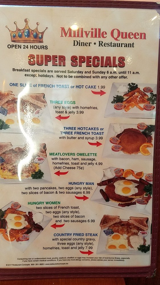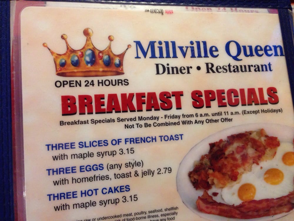 Millville Queen Diner, an American diner located in Millville, NJ, offers a variety of breakfast options, including eggs, omelettes, and breakfast sandwiches. Customers rave about the generous portion sizes and affordable prices, with options like the Hungry Woman Special garnering high praise for quality and value. The diner's friendly owners and staff provide excellent service, making every visit a pleasant experience. The menu boasts a wide selection of dishes, including omelets, flounder, shrimp, burgers, and more, all consistently delicious. The recent revamp of the diner has created a clean and welcoming atmosphere, adding to the overall dining experience. With a diverse menu, friendly service, and affordable prices, Millville Queen Diner is a must-visit for a satisfying and budget-friendly meal.